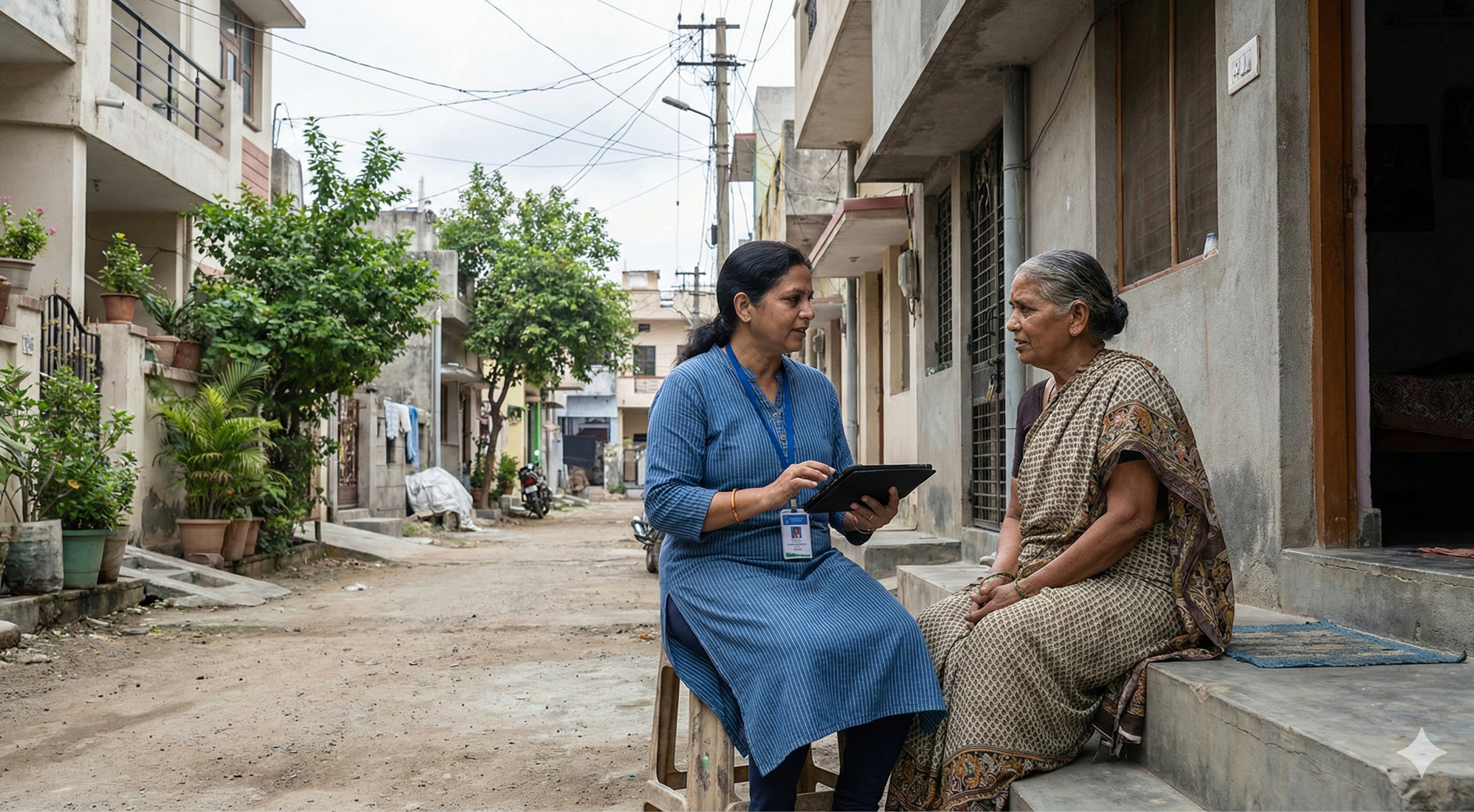 community women health workers anchor care delivery, supported by AI-driven decision and follow-up systems.